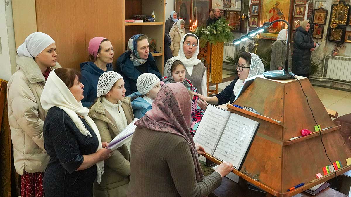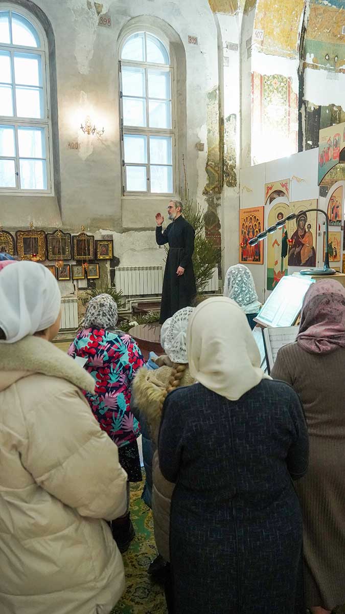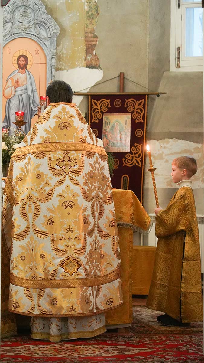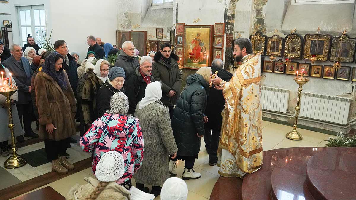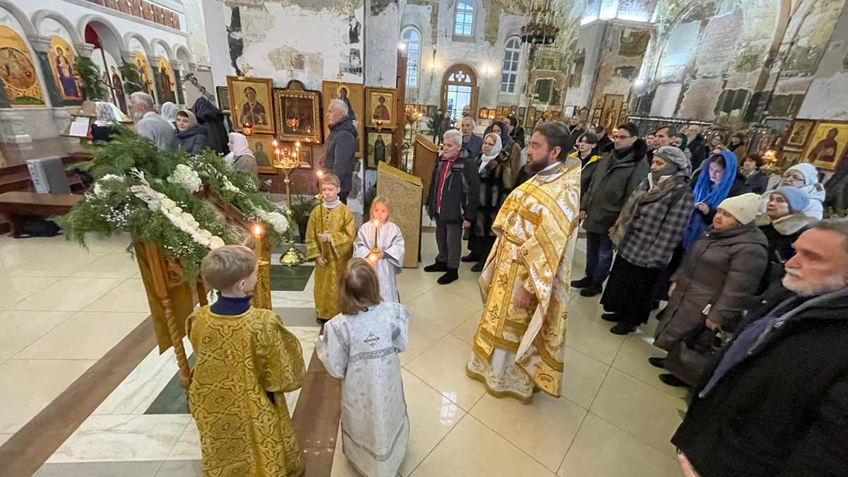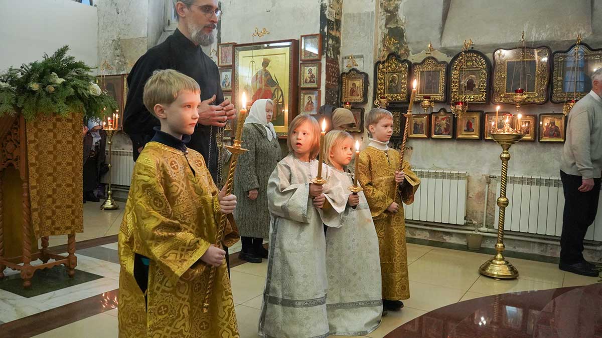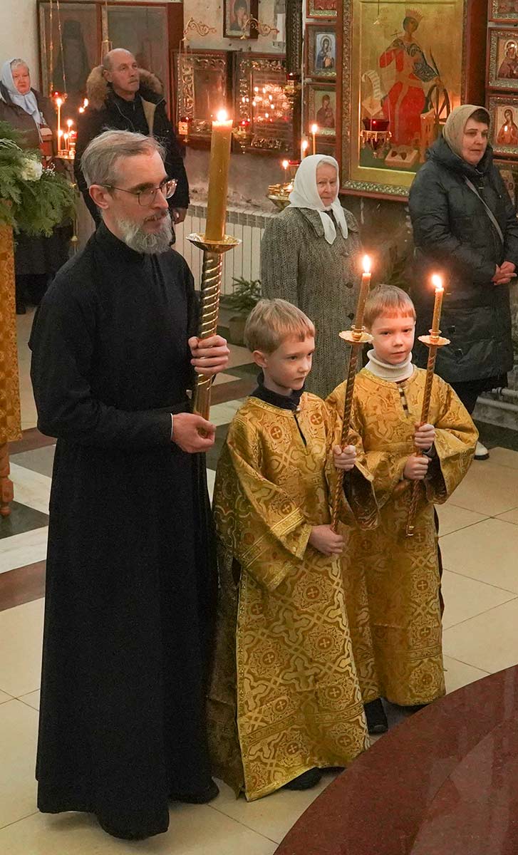 7 января 2026 года, в праздник Рождества Христова, поздняя Божественная литургия в храме прп. Василия Исповедника была очень необычной, светлой и трогательной. На клиросе пела хоровая группа учеников воскресной школы под управлением регента хора нашего храма Людмилы Ефимовой, среди алтарников тоже были дети. Богослужение совершил клирик храма игумен Серафим (Кравченко).